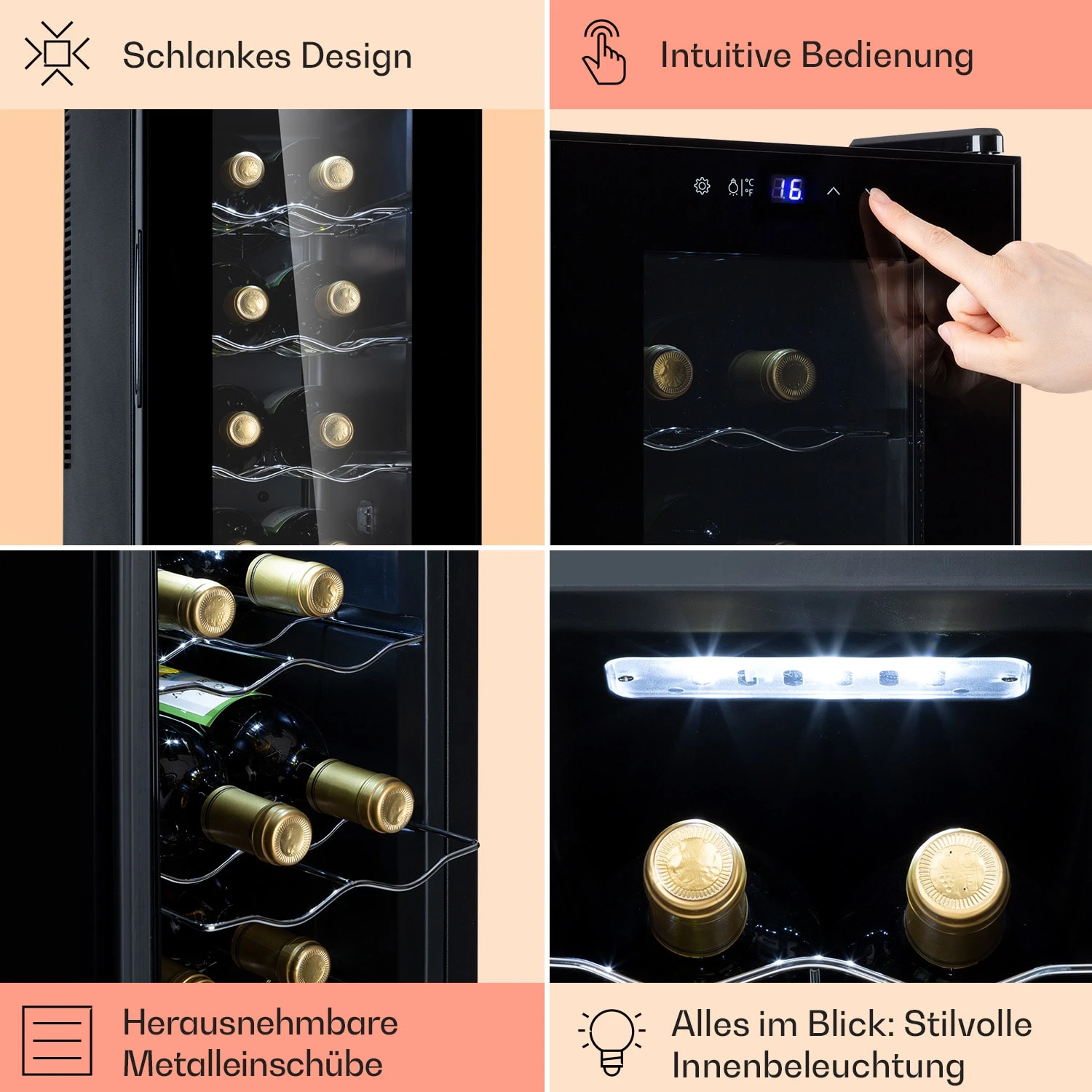 - Lagerung von bis zu 14 Flaschen (bei Standardflaschen bis 310 mm Höhe und einem Durchmesser von 7,6 oder 8,2 cm)