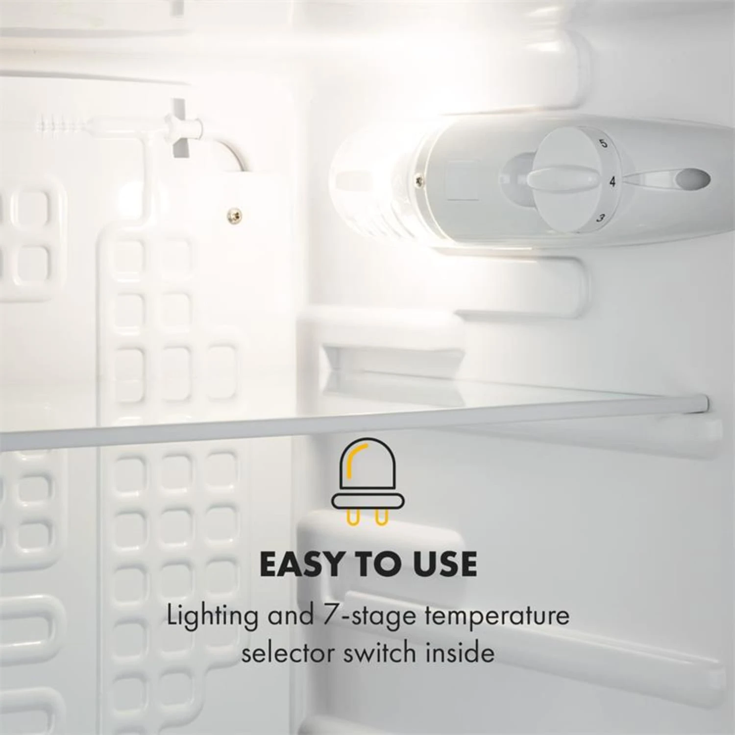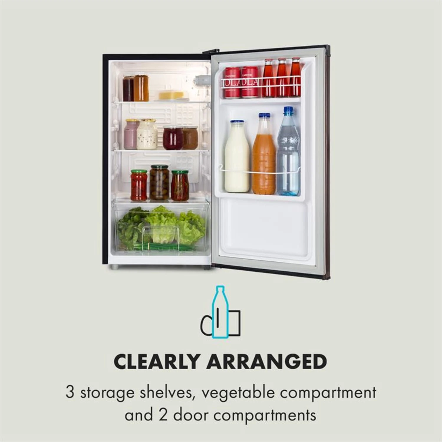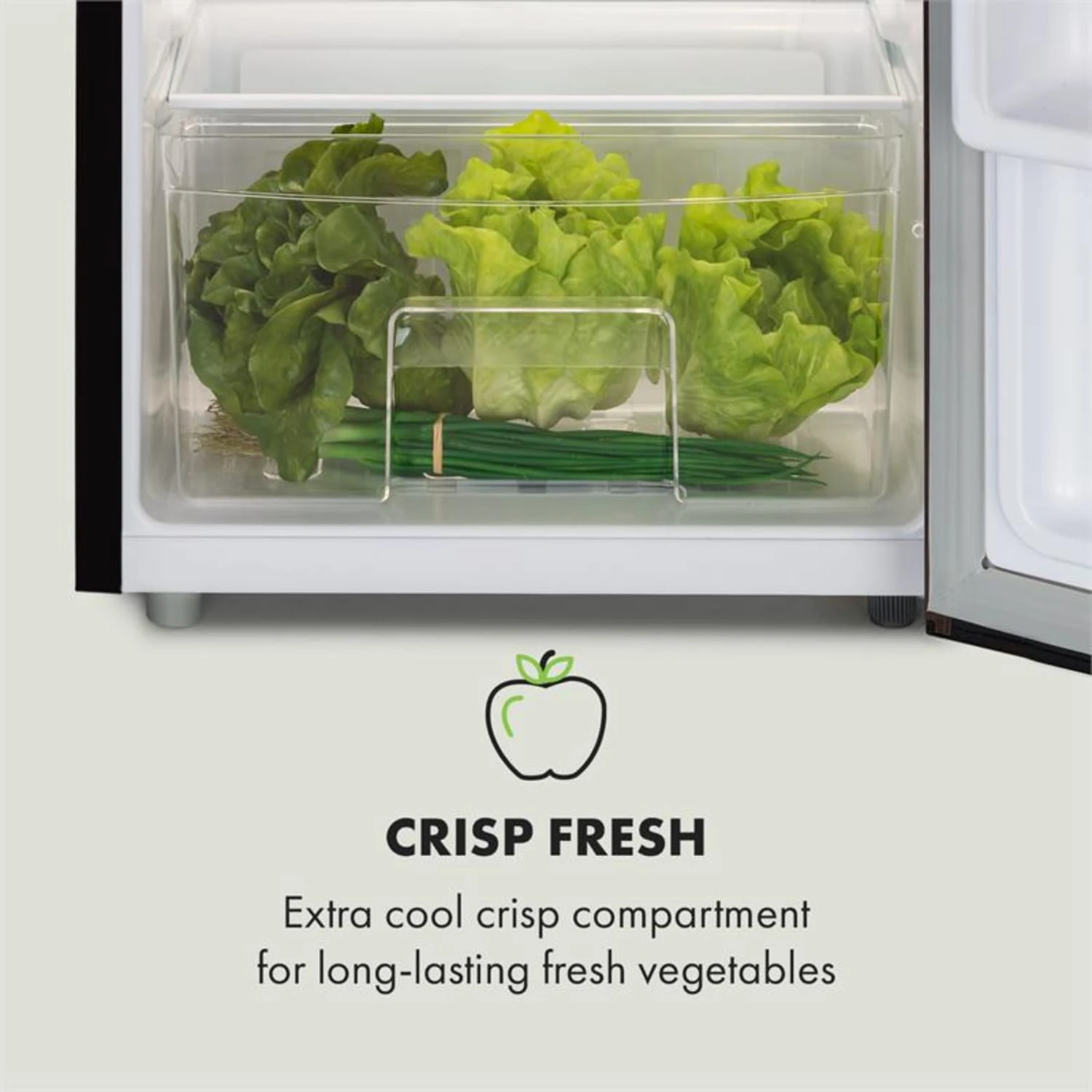 Für Singles, Kleinhaushalte, Partyräume oder Gartenhäuschen: Mit 90 Litern Nutzinhalt bietet der Klarstein Feldberg Kühlschrank auf 3 Ebenen viel Platz für Lebensmittel aller Art. Individuelle Ordnung schaffen dabei zwei Glasregale, die auf vier Einschüben je nach Lagerbedarf eingesetzt werden können. Das extra kühle Crisper Gemüsefach im Boden hält Obst und Gemüse bei nahezu 0 °C besonders lange frisch und knackig. Zwei Türfächer bieten den nötigen Stauraum für Flaschen und Gläser – hier hat einfach alles seinen Platz. Damit der Kühlschrank optimal an alle Stellplatzwünsche angepasst werden kann, ist der Türanschlag mit wenigen Handgriffen wechselbar.