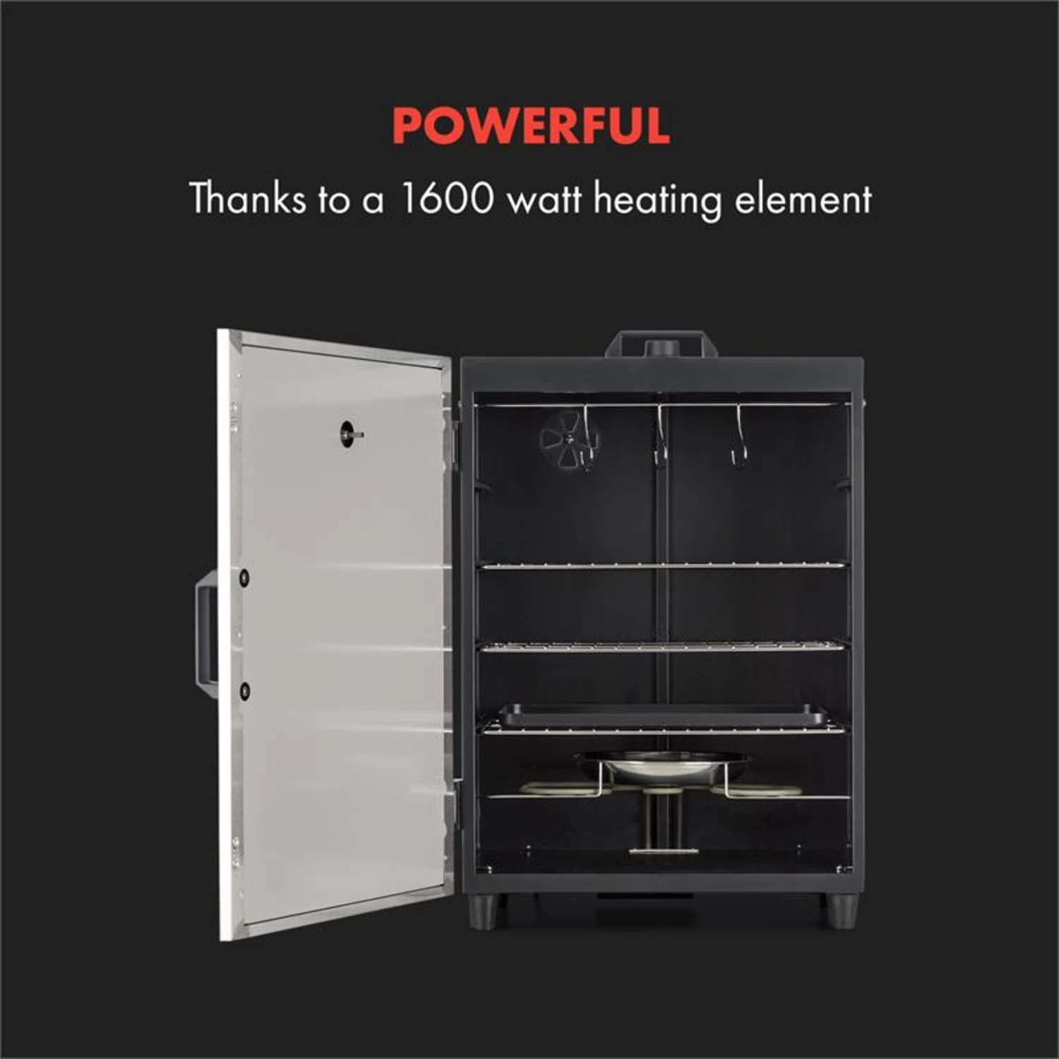 Entdecken Sie die traditionelle Kunst des Räucherns. Mit dem Klarstein Flintstone Steel Räucherofen verleihen Sie verschiedensten Speisen ganz nach eigenen Wünschen den richtigen Geschmack. Und nebenbei erhalten Fleisch, Fisch oder Wurstwaren eine deutlich längere Haltbarkeit! Mit einem 1600 Watt starken, elektrischen Heizelement sowie einem regelbaren Thermostat an der Oberseite des Gerätes bringt der Ofen die Aromaholzschnitzel ordentlich zum Rauchen und gart gleichzeitig die Räucherware ganz langsam zur Perfektion. Drei verchromte Räucherroste mit jeweils 40 x 25 cm Fläche bieten reichlich Platz für Speckseiten, Tofublöcke oder eigene Wurstkreationen, während drei Haken zusätzlichen Platz zum Aufhängen von Würsten oder Schinken bieten. Eine herausnehmbare Tropfschale fängt Kondenswasser und abtropfendes Fett und erleichtert die anschließende Reinigung. Die Dichte des Rauchs wird beim Klarstein Flintstone Steel Räucherofen ganz bequem über eine rückseitige Lüftungsklappe reguliert. Ein in die Tür integriertes Thermometer bis 300 °C macht die Überwachung der Räuchertemperatur ganz einfach. Räucherschnitzel und -aromen werden in der herausnehmbaren Edelstahlschüssel direkt über dem elektrischen Heizelement in leckeren Rauch verwandelt. Dank der Leichtbauweise und einem topseitigen Tragegriff lässt sich der Räucherofen mit wenig Aufwand versetzen.