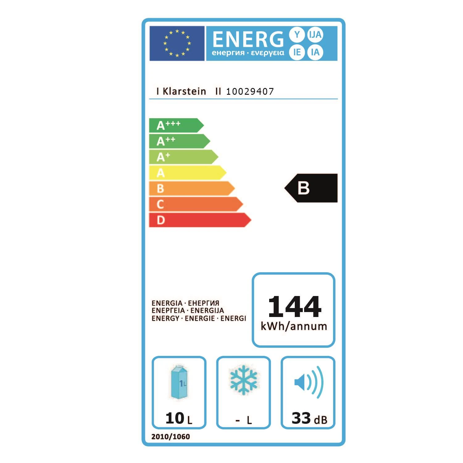 Über einen Drehregler an der Rückseite lässt sich die gewünschte Kühltemperatur zwischen 12 und 18° C regulieren. Eine integrierte Beleuchtung hilft auch bei fehlendem Umgebungslicht, schnell das Gewünschte aus dem Minikühlschrank zu entnehmen. Dabei ist das 65 Watt Gerät äußerst sparsam im Verbrauch, was ihm die Energieeffizienzklasse B einbringt.