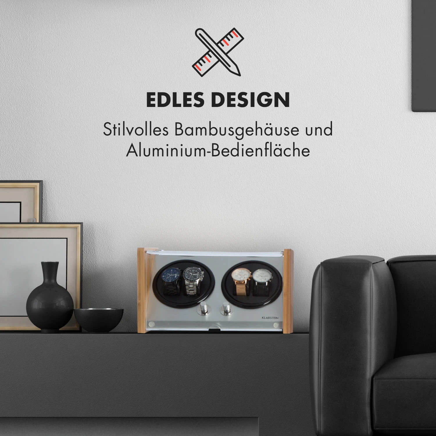 Der Hanoi 4 Uhrenbeweger überzeugt mit einem eleganten Bambusgehäuse, das sich stilvoll in jedes Raum-Ambiente einfügt. Eine Bedienfläche aus gebürstetem Aluminium verleiht der Konstruktion seinen unverwechselbaren Glanz, währende das großzügig geschnittene, von oben und frontal einsehbare Sichtfenster aus Acrylglas einen unverstellten Blick auf die Automatikuhren freigibt.
