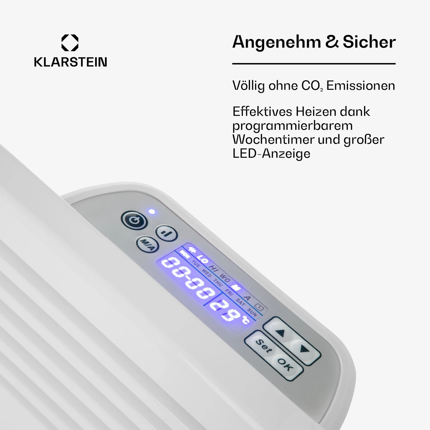 Die Klarstein Hot Spot Slimcurve Wandheizung revolutioniert die Beheizung mit seinem X-shape Aluminium-Heizelement. In Rekordzeit erwärmt es mit 1000 oder 2000 Watt Leistung die Luft und bringt sie dank Konvektions-Arbeitsprinzip zum zirkulieren. So sind in Windeseile Räume bis 40 m² zu Kuschelwärme aufgeheizt. Superflach kann das 80 x 40 cm große Heizgerät direkt an der Wand befestigt oder mit optional verfügbaren Bodenrollen vollmobil als Standgerät genutzt werden. Dank der spritzwassergeschützten Bauweise nach IP24 idealerweise im Bad, wobei es natürlich auch jeden anderen Raum widerspruchslos beheizt. Immer die richtige Wärmeleistung dank Cleverheat Programming: Das integrierte Thermostat kann auf Temperaturen zwischen 5 und 40 °C eingestellt werden und erkennt selbstständig, wann starke oder schwache Heizleistung erforderlich ist, um die Raumtemperatur auf den gewünschten Level zu bringen. Ein ebenfalls vorhandener Wochentimer ermöglicht die wunschgerechte Programmierung der Heizzeiten für jeden Wochentag – so ist immer ein angenehm warmes Badezimmer garantiert. Alle Einstellungen werden direkt am LED-Panel des Heizgeräts vorgenommen.