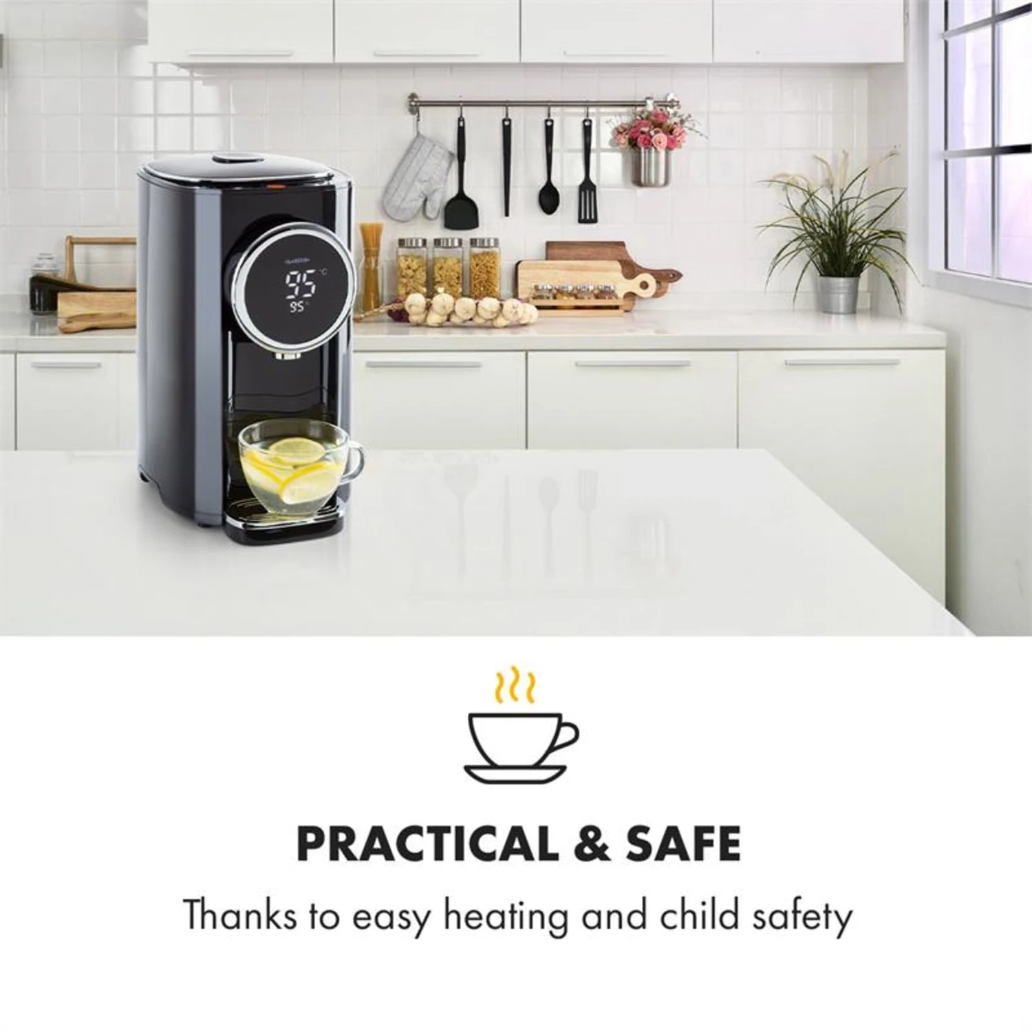Es gibt viele Gelegenheiten, zu denen sich ein Betrieb des Klarstein Hot Spring Plus Heißwasserspenders anbietet: Schnell einen Tee in der gewünschten Temperatur aufbrühen oder Instant-Suppen mit der exakt benötigten Menge Wasser zubereiten sind nur zwei der vielen Möglichkeiten. Der große Edelstahl-Wassertank des Hot Spring PlusHeißwasserspenders nimmt dabei bis zu 5 Liter Wasser auf und eignet sich neben dem Privathaushalt auch hervorragend fürs Büro. Die Bedienung des Heißwasserspenders mit Trockengeh- und Überhitzungsschutz ist denkbar einfach: An der Oberseite befindet sich die Touch-Oberfläche mit jeweils einer Taste für Erhitzen, Temperatur (45-95 °C), Wasserausgabe, zum Lösen der Kindersicherung sowie für gefiltertes Wasser. Es müssen nur die gewünschte Füllmenge und Temperatur eingestellt und die Ausgabetaste gedrückt werden – schon erhält man sehr zügig perfekt temperiertes, heißes Wasser. Dadurch ist die Handhabung kinderleicht und wird schnell zur angenehmen Routine. Die Tropfwanne kann mit einem Handgriff abgenommen und bei Bedarf gespült werden, während die vielfältigen Funktionen wie schnelles Abkühlen sowie der Wasserstands-Alarm die Bedienbarkeit des Gerätes zusätzlich erleichtern. Durch sein großes, übersichtliches Display werden nicht nur alle wichtigen Informationen jederzeit im Blick behalten – der Heißwasserspender wird dadurch auch zum besonderen Blickfang und fügt sich nahtlos in jedes Küchenambiente ein.