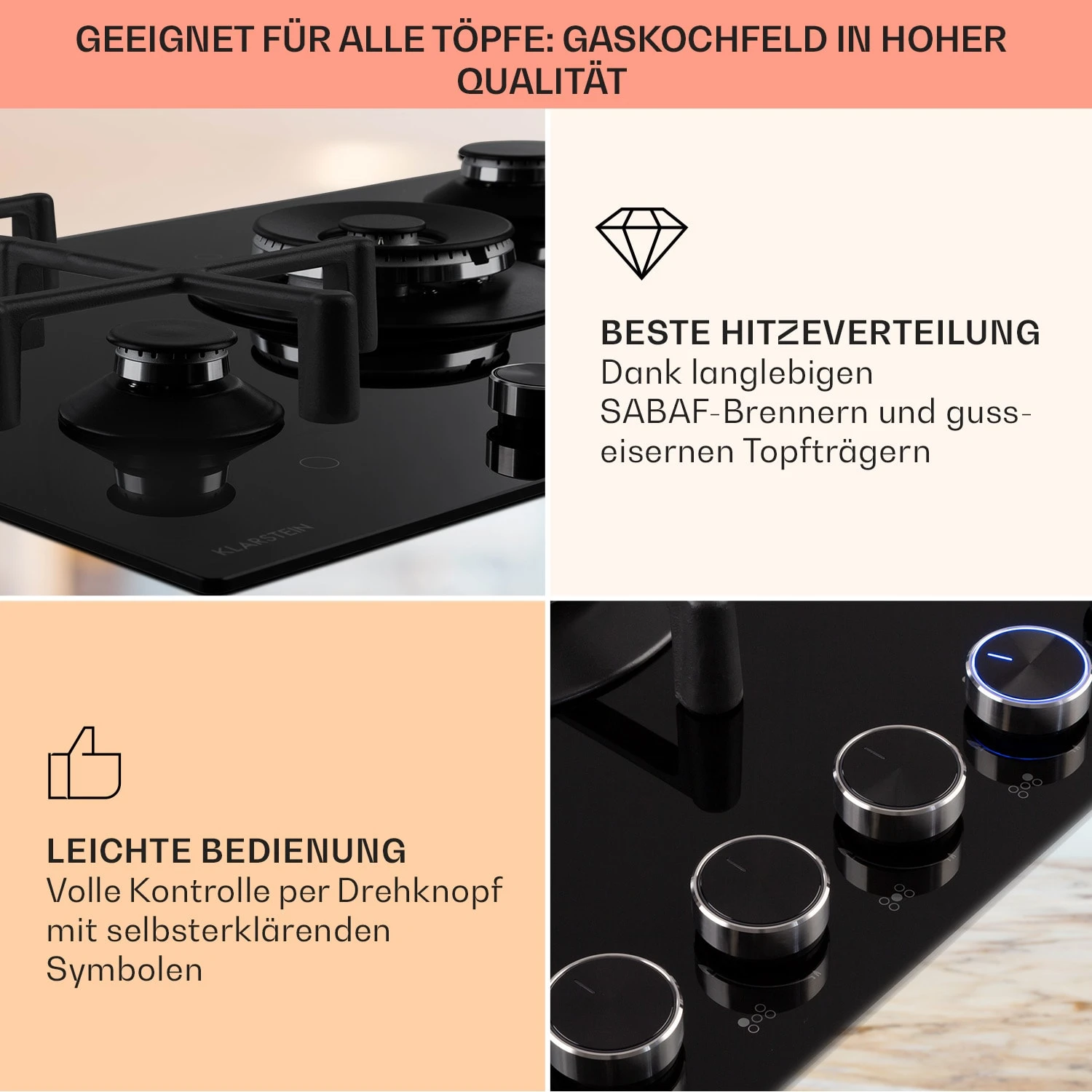 Auf dem platzsparenden Klarstein Illuminosa 5 Kochfeld befinden sich fünf hochwertige Sabaf-Brenner, die mit einer Leistung von 4 kW, 3kW, 2 x 1,75 kW und 1,0 kW ordentlich einheizen. Alle Brenner verteilen die Hitze gleichmäßig in der Mitte und an den Rändern der Töpfe oder Pfannen, alles wird perfekt und bestmöglich gegart. Die Kreuze aus massivem Gusseisen sind für beinahe alle Arten von Kochgeschirr geeignet und sitzt passgenau und kippsicher über den Flammen. Dafür sorgt die integrierte Magnethalterung, sodass keine Mulde oder Befestigungslöcher die Oberfläche des Herds mehr stören. Die Bedienung ist dank der selbsterklärenden Symbole an den großen Drehknöpfen absolut intuitiv. Für optimale Sichtbarkeit der Einstellungen sorgen integrierte LEDs, die die Regler zum Leuchten bringen. In der leichten Regulierbarkeit liegt auch der große Vorteil von Gasherden: Die Hitzezufuhr kann während des Kochvorgangs immer wieder direkt angepasst werden. Änderungen an der Flammengröße wirken sich unmittelbar in Temperaturänderungen an Topf oder Pfanne aus. Natürlich haben wir auch auf die Sicherheit am Herd geachtet: Zusätzliches Feuer zum Entzünden ist nicht nötig. Die Gasflamme wird einfach per elektrischer Zündung entfacht. Der Flammenausfall-Schutz schließt die Gaszufuhr zum Brenner, sollte die Flamme aus irgendeinem Grund einmal ausfallen.