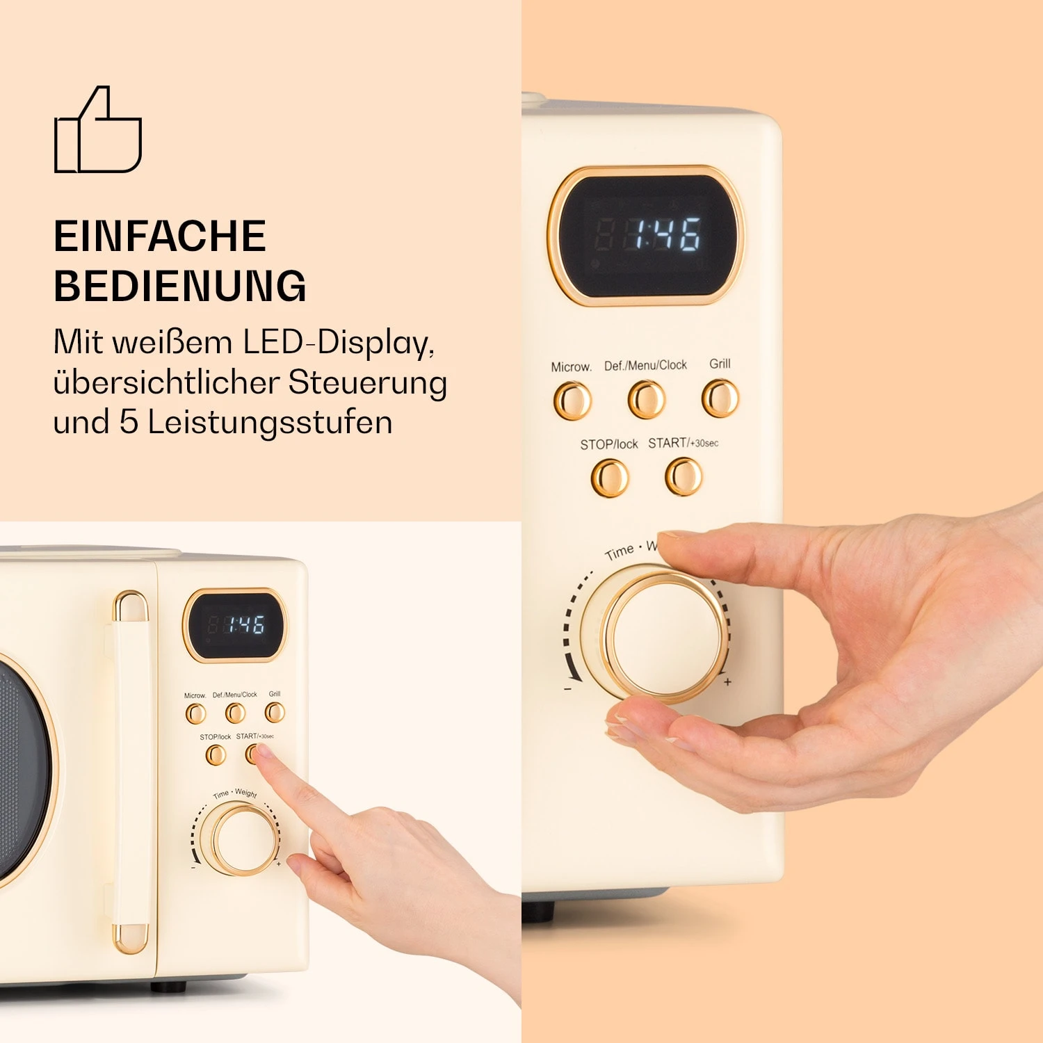 - 5 Leistungsstufen für die Mikrowelle: Low, Medium Low (Auftauen), Medium, Medium High, High