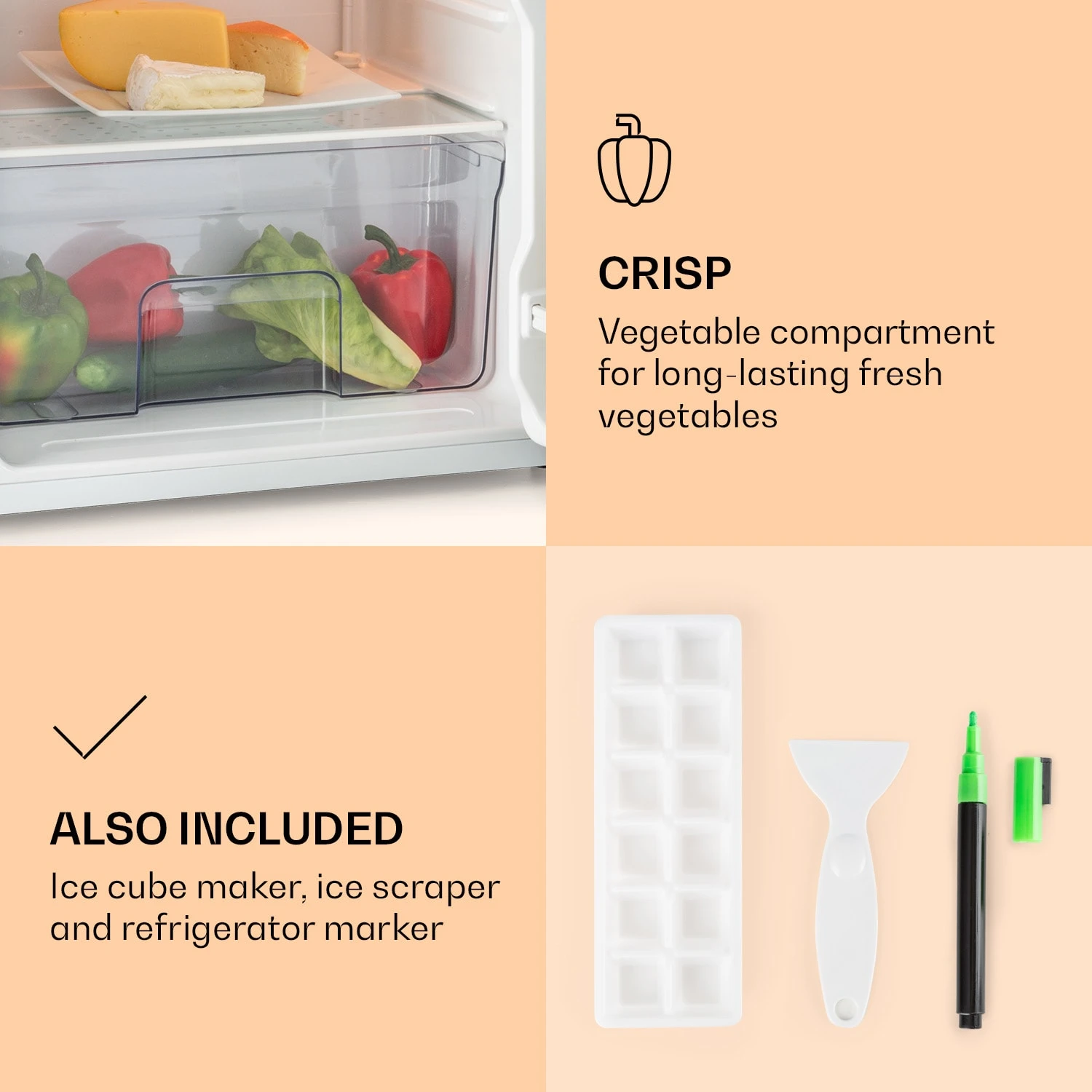Der Klarstein Spitzbergen Uni ist nicht nur ein Kühlschrank, seine Front-Oberfläche ist wie ein White Board mit geeigneten Markern beschreib- und wieder abwischbar. Sie bietet viel Platz für Einkaufslisten, Notizen oder sogar Liebesbotschaften. Sein geräumiges Kühlfach mit 81 Litern Volumen und das topseitige Gefrierabteil mit 10 Litern bieten viel Platz für deine Lebensmittel. Für Ordnung sorgen zwei Einlegeböden, 3 Türfächer und ein Gemüsefach. Über einen 5-stufigen Drehregler kannst du die Temperatur individuell einstellen.
