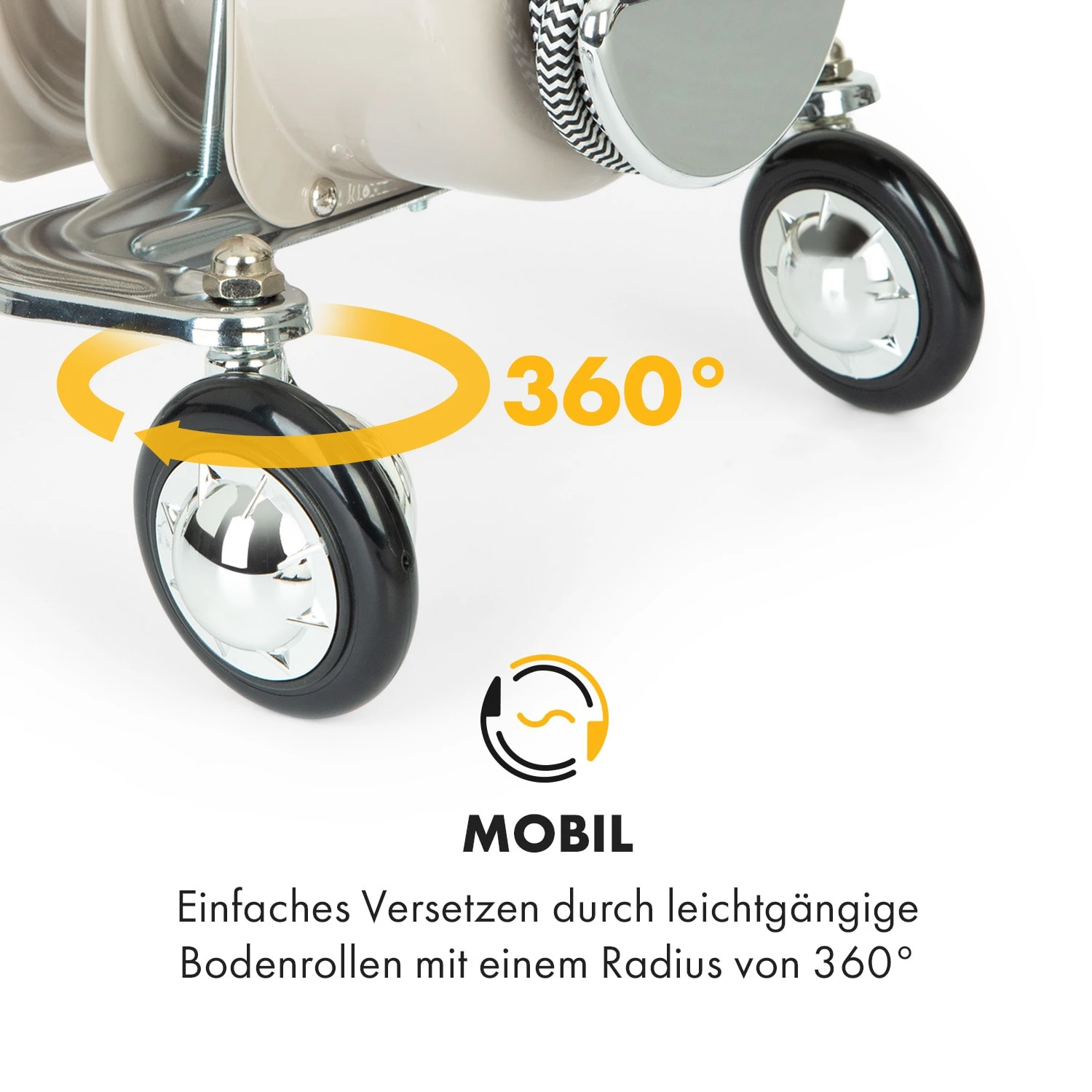 Für die mobile Nutzung sorgen das geringe Gewicht und 4 Bodenrollen mit einem Radius von 360°, mit denen die Elektroheizung ganz einfach ihren Standort wechseln kann. Schnell angenehme Temperaturen im Zimmer oder Büro, in der Werkstatt oder Garage: Der Thermaxx Retroheat Ölradiator von Klarstein ist für jeden Haushalt nicht nur optisch ein Gewinn!
