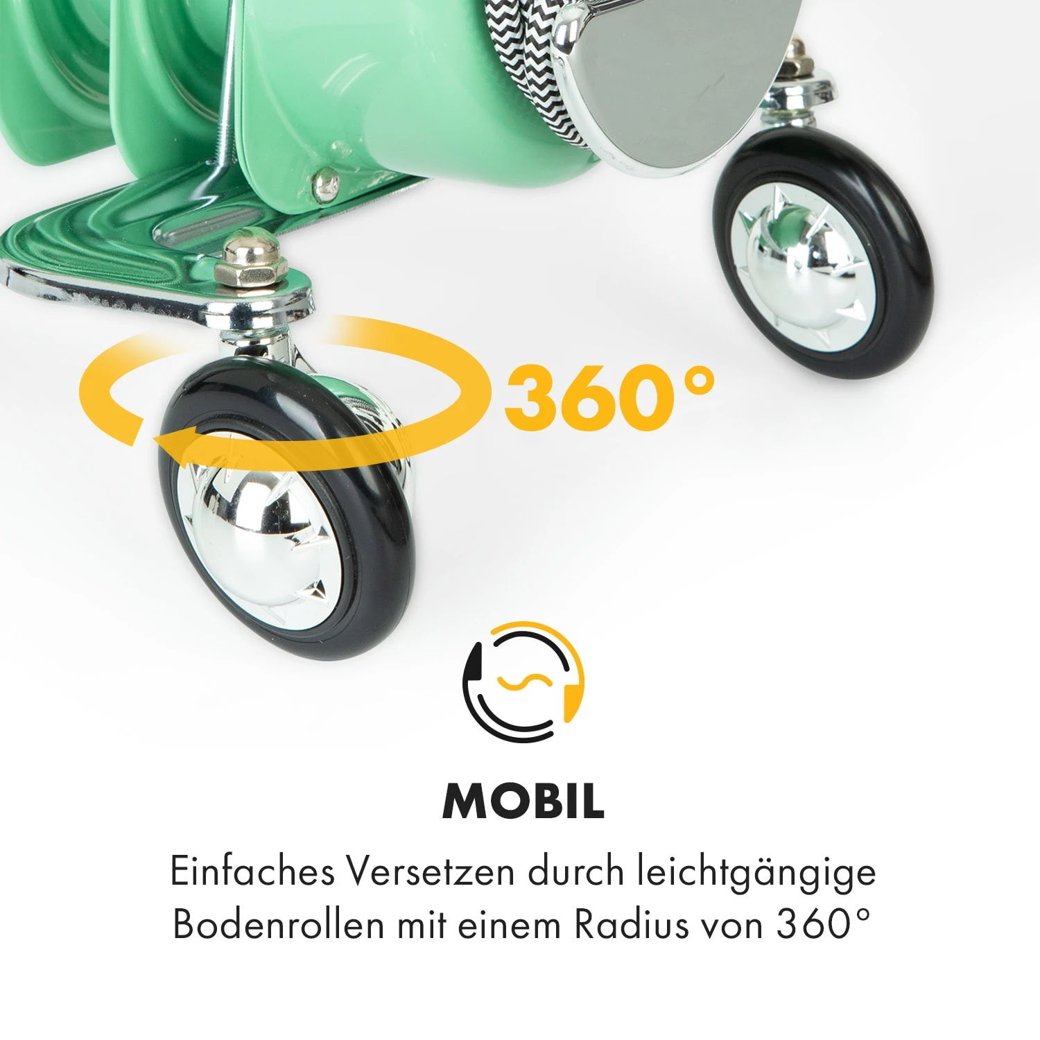 Für die mobile Nutzung sorgen das geringe Gewicht und 4 Bodenrollen mit einem Radius von 360°, mit denen die Elektroheizung ganz einfach ihren Standort wechseln kann. Schnell angenehme Temperaturen im Zimmer oder Büro, in der Werkstatt oder Garage: Der Thermaxx Retroheat Ölradiator von Klarstein ist für jeden Haushalt nicht nur optisch ein Gewinn!