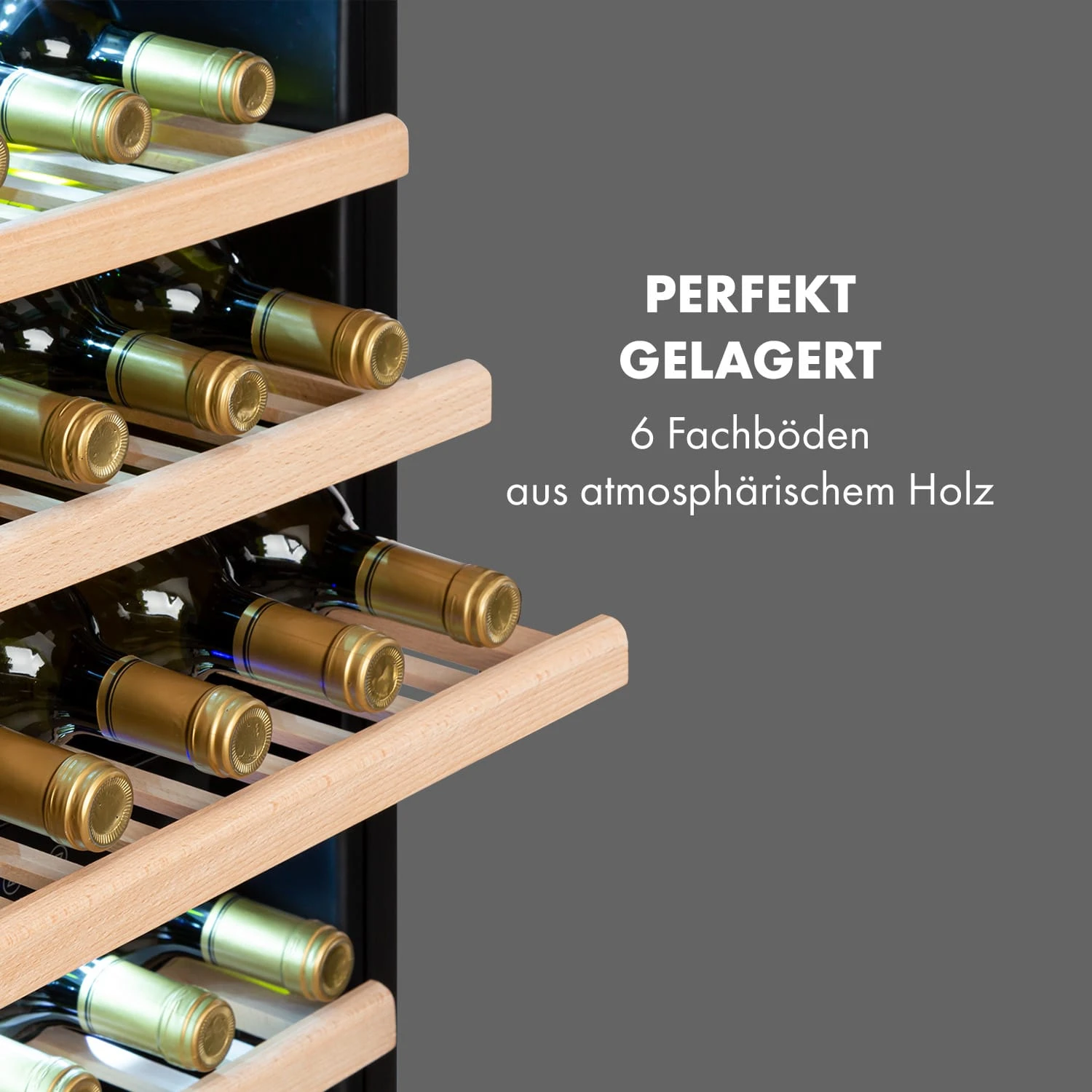 Auf 3 Holzböden bietet der Klarstein Vinsider 41D Built-In Duo Weinkühlschrank Platz für 41 Flaschen Wein. Er bietet nicht nur optimale Lagerbedingungen, sondern setzt die Flaschen auch noch gekonnt in Szene. So kannst du deine edlen Weinvorräte beleuchten und durch die Glastür raffiniert inszenieren. Durch die zwei unterschiedlich temperierbaren Kühlzonen kannst du weiße und rote Weine gleichzeitig kühlen. Das intuitive Touch-Display mit digitaler Anzeige bietet dir dabei eine sehr komfortable Bedienung.